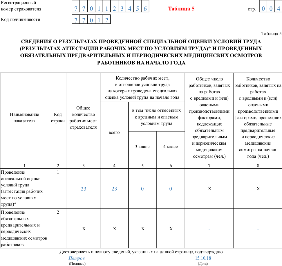 - Таблица 5, включающая сведения о проведенной спецоценке условий труда и медосмотрах.