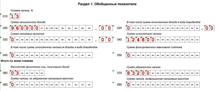 Всего с 1 января 2017 года по 31 марта 2017 года была начислена зарплата в пользу 3-х работников в сумме 960 000 р. Всего был начислен НДФЛ в размере 124 800 р. (960 000 р. x 13%). Однако из этой суммы фактически был удержан налог в размере 83 200 р. (640 000 р. x 13%).
