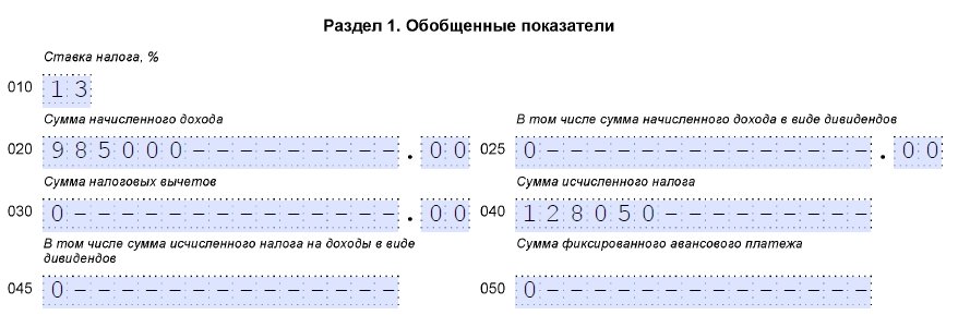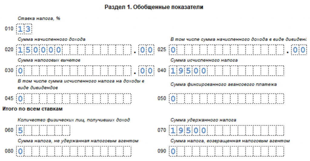 В разделе 1 6-НДФЛ показывают общую сумму начисленных доходов, вычетов, а также общие суммы начисленного и удержанного налога.