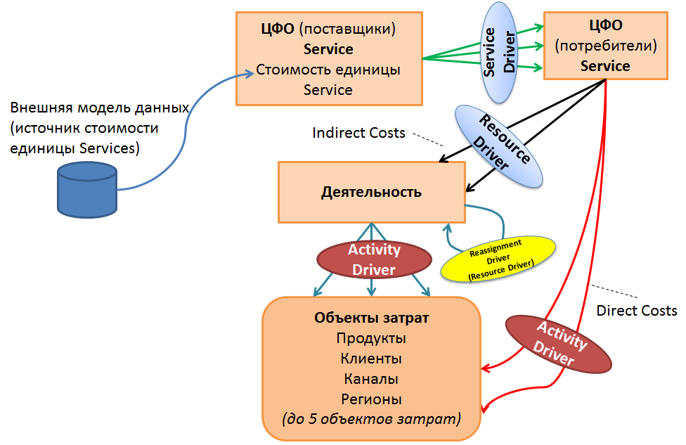 - Драйвер затрат — параметр, пропорционально которому затраты переносятся на стоимость ресурсов. Например, арендная плата (затраты) распределяется на конкретных сотрудников (ресурсы) пропорционально занимаемой ими площади помещения (драйвер затрат).
