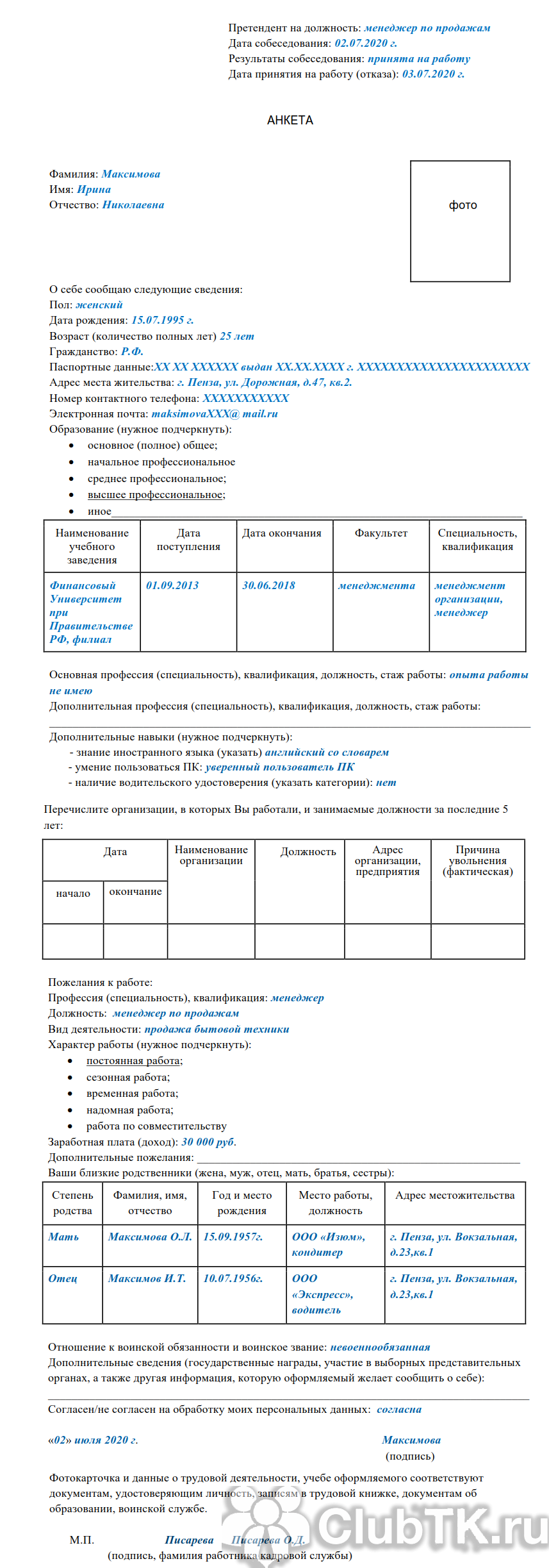 Соискатель заполняет все пункты разборчивым почерком, стараясь избегать исправлений. Если человек затрудняется ответить на вопрос или не хочет этого делать, требовать ответ запрещено. Пример, как заполнять опросник:
