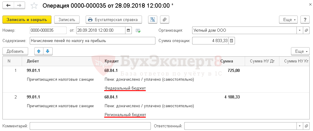 - Субконто 1 — Вид платежа в бюджет — Пени: доначислено / уплачено (самостоятельно);