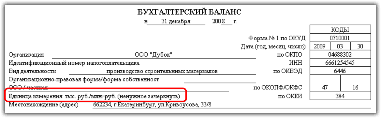 Отражение сумм в балансе происходит с учетом уменьшения сумм на три или шесть нулей (в тысячах или миллионах). Так, если стоимость недвижимости, которая находится во владениях данной компании, составляет 10 000 000 рублей, то в балансе эта сумма может быть отражена как 10 000 тысяч. Некоторые компании, масштаб деятельности которых очень большой, могут использовать собственное сокращение, удобное для них.