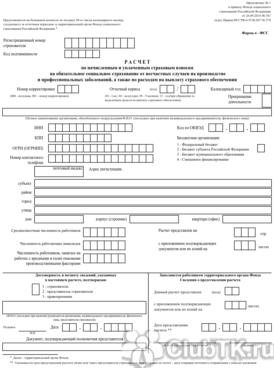 В 2019 году расчет по страховым взносам на страхование от несчастных случаев на производстве и профзаболеваний сдается по форме 4 ФСС. Эта форма утверждена Приказом фонда соцстраха от 26.09.2016 № 381 с изменениями, внесенными Приказом ФСС от 07.06.2017 № 275, который уточнил эту форму, внося изменения в титульный лист и табл. 2. Поэтому «новой» форму можно называть весьма условно.