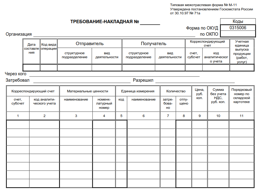 Унифицированная форма М-11 незаменима в тех организациях, где ведется неограниченный отпуск ТМЦ. Она позволяет вести контроль выдачи и использования материалов, а по завершении отчетного периода все данные по требованиям-накладным вносятся в журнал учета по соответствующим субсчетам.