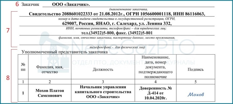 8. Указывается данные о представителе заказчика. Обязательно указать документ в столбике 4, подтверждающий полномочия.