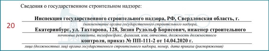 20. Данные заполняются, если предусматривается государственный строительный надзор. Все данные аналогичны остальным организациям. Как правило, сведения заполняет сам строй надзор.