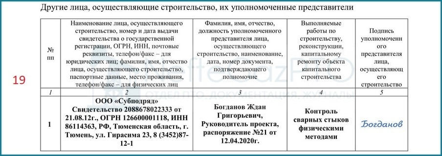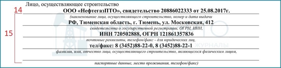 16. Указываются данные лиц, осуществляющих строительство. Эти же сотрудники будут подписывать большинство актов в исполнительной документации. Поэтому стоит предусмотреть и вписать сюда сотрудников, которые состоят в национальном реестре специалистов в области строительства. Так же в соответствии с РД 11-05-2007 п. 8 только указанные лица уполномочены заполнять разделы ОЖР..