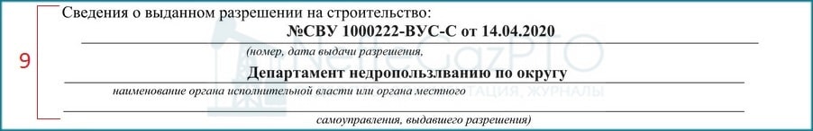 9. Вписываются данные по разрешению на строительство, выданное государственным органом: