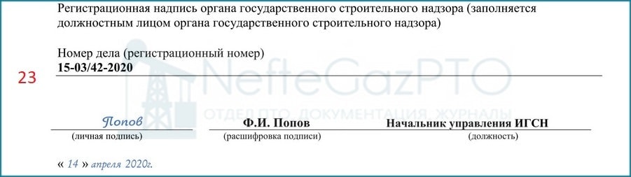 23. Запись о регистрации объекта подлежащего государственному строительному надзору. Данную запись делает сотрудник стройнадзора.