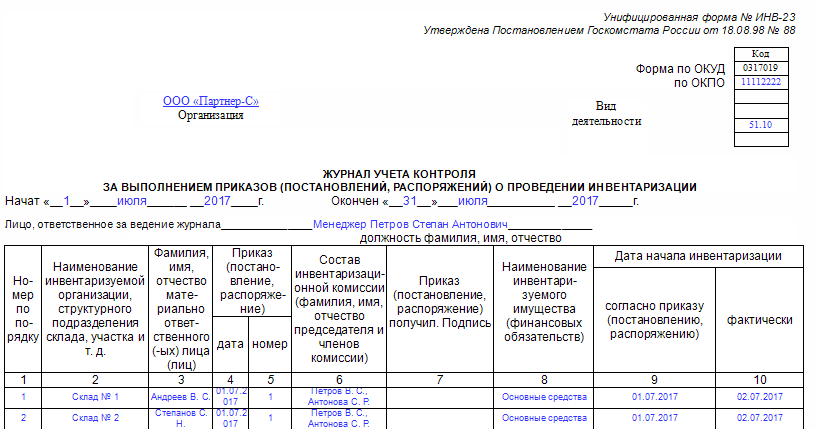 На сегодняшний день законодательство разрешает компании разработать и утвердить собственную форму приказа о проведении инвентаризации, однако на практике зачастую более удобно воспользоваться готовой формой ИНВ-22. В нем обязательно отражается такая информация: