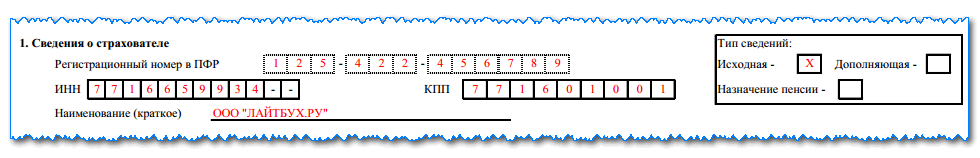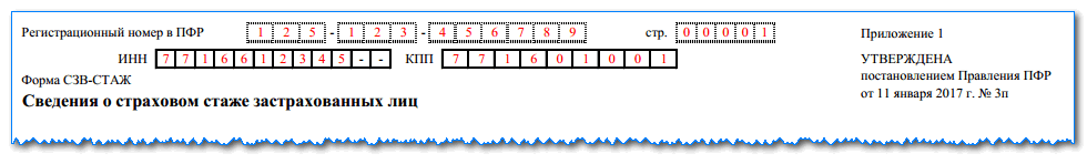 В самом верху записывается регистрационный номер, присвоенный субъекту бизнеса в Пенсионном фонде.