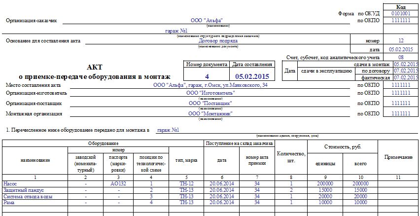 Основанием для заполнения акта о приемке-передаче оборудования в монтаж ОС-15 обязательно является документ, к примеру, договор подряда.