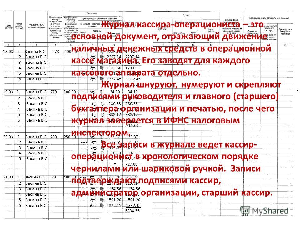 Васина В.С Васина В.С Васина В.С Васина В.С Васина В.С Васина В.С Васина В.С Васина В.С Васина В.С Васина В.С Васина В.С Васина В.С Васина В.С Васина В.С Васина В.С Васина В.С Васина В.С Васина В.С Васина В.С Васина В.С Васина В.С Васина В.С Васина В.С Б/нал Журнал кассира-операциониста – это основной документ, отражающий движение наличных денежных средств в операционной кассе магазина. Его заводят для каждого кассового аппарата отдельно. Журнал шнуруют, нумеруют и скрепляют подписями руководителя и главного (старшего) бухгалтера организации и печатью, после чего журнал заверяется в ИФНС налоговым инспектором. Все записи в журнале ведет кассир- операционист в хронологическом порядке чернилами или шариковой ручкой. Записи подтверждают подписями кассир, администратор организации, старший кассир.