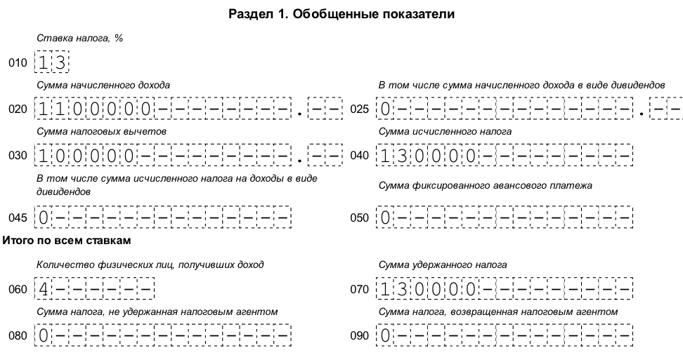 В Разделе 1 «Обобщенные показатели» укажите общую сумму начисленных доходов, предоставленных вычетов, а также общую сумму начисленного и удержанного налога. Раздел 1 заполняйте нарастающим итогом за I квартал, полугодие, девять месяцев и год (письмо ФНС от 18.02.2016 № БС-3-11/650). В состав обобщенных показателей включайте доходы (вычеты, суммы налога) по операциям, совершенным в течение отчетного периода. Например, в разделе 1 за девять месяцев отражайте показатели – с 1 января по 30 сентября включительно.
