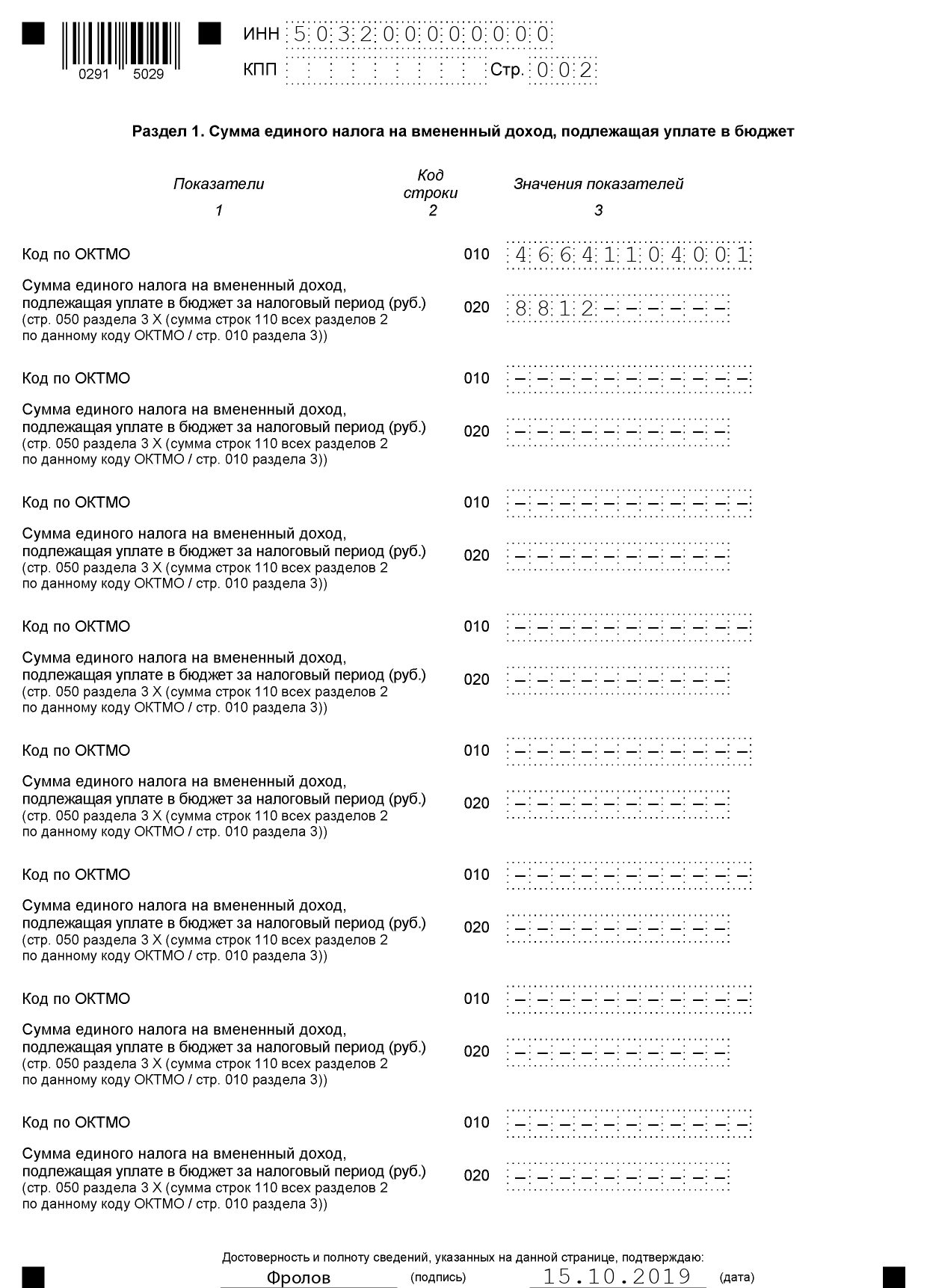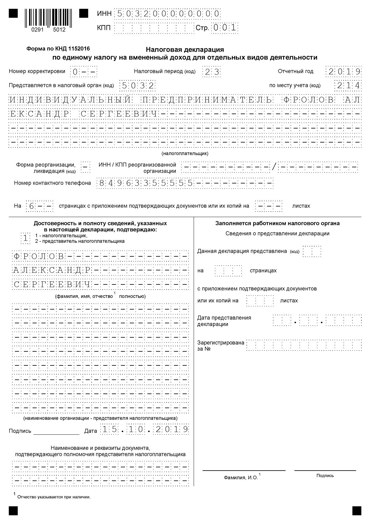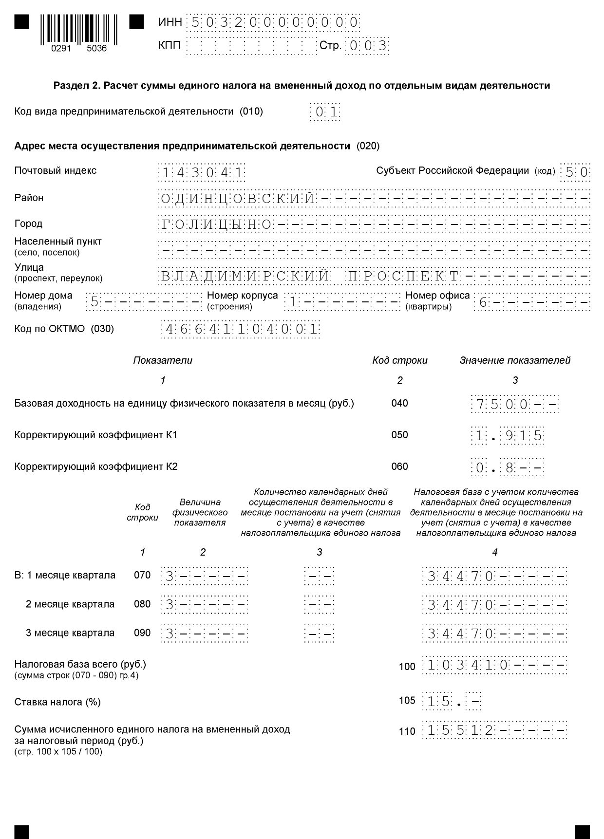 Пример заполнения декларации по ЕНВД за 3 квартал 2019 года