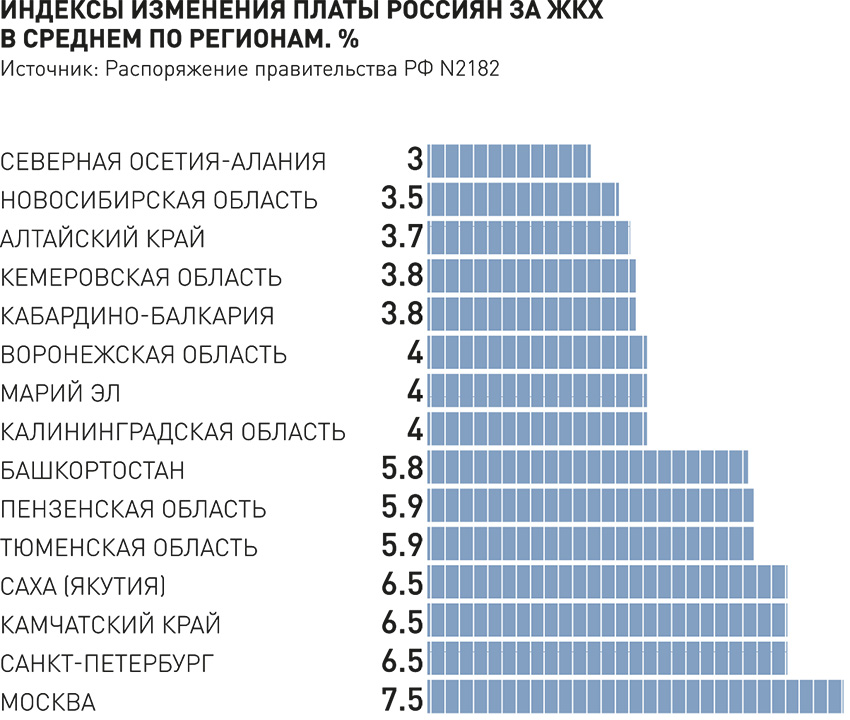 При этом правительство установило для каждого региона максимальные значения индексации. Самый низкий порог роста совокупного платежа установлен в Северной Осетии (3%), высокий — в Москве (7,5%).