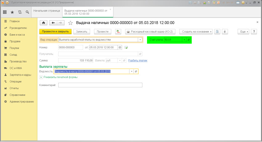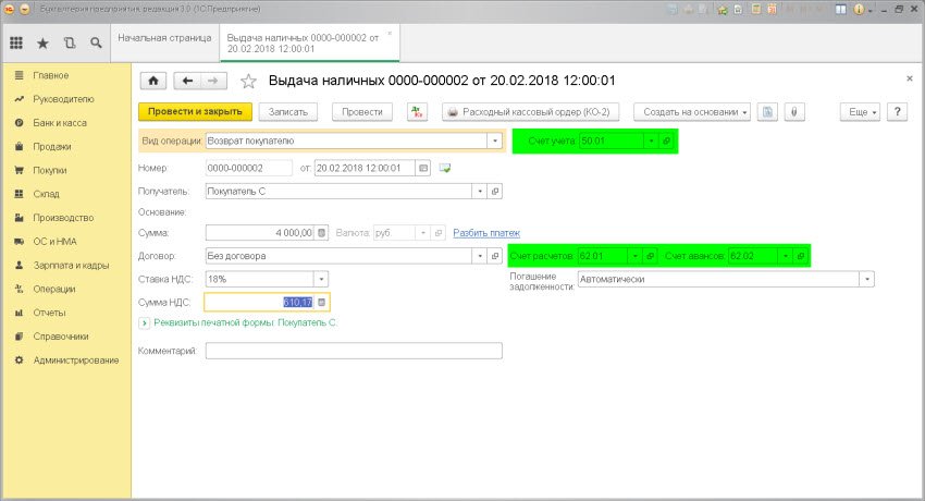 Документ 1С 8.3: Выдача наличных.
