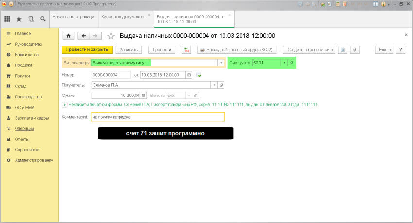 Документ 1С 8.3: док.»Выдача наличных» — вид операции.Выдача подотчетному лицу.