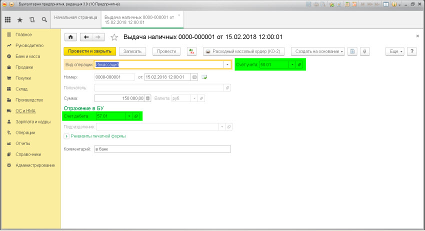Описание: проводкой мы зафиксировали «информацию» об увеличении денег в пути (счет 57) и проводкой мы зафиксировали «информацию» об уменьшении наличных денег в кассе (счет 50).Сумма: сумма списания наличных денежных средствДокумент 1С 8.3: док.»Выдача наличных» — вид операции.Инкассация.