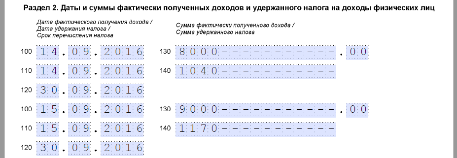 В разделе 2 годового расчета 6-НДФЛ за 2017 год нужно отразить даты получения и удержания налога, крайний срок, установленный для перечисления налога в бюджет, а также суммы фактически полученных доходов и удержанного НДФЛ.