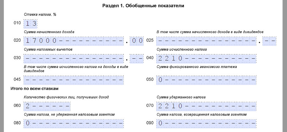 **В рассматриваемом примере общая сумма перечислений составляет 9 600 рублей, поскольку изначально оговаривалось, что других выплат за расчётный период не происходило. На практике эта сумма будет значительно выше. В этой графе указывается общий размер дохода по всем сотрудникам фирмы.