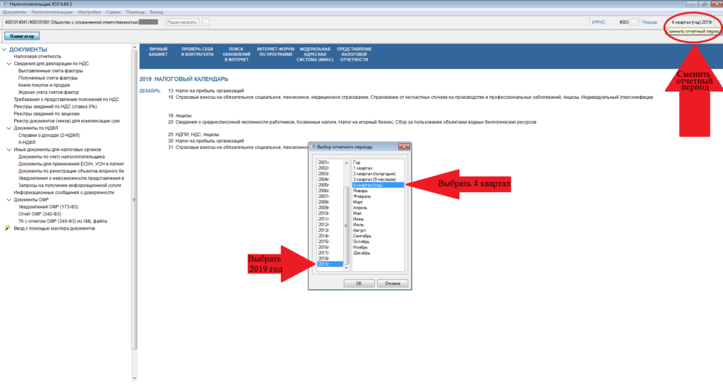 Когда нужный налогоплательщик внесен (выбран), в правом верхнем углу открывшегося главного окна нажимаем кнопку смены отчетного периода и в появившейся таблице выбираем необходимые параметры