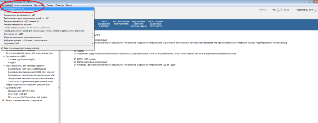 Следующий шаг: слева на верхней панели нажимаем на слово «Документы» и в открывшемся меню выбираем «Налоговая отчетность».