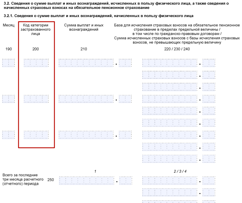Упростить обработку информации, которую содержит расчёт, также помогают коды категории застрахованного лица. Их присваивают группам людей при их соответствии определенным условиям. Это могут быть сотрудники, которые работают в особо тяжелых условиях, занимаются интеллектуальной деятельностью и т. д.