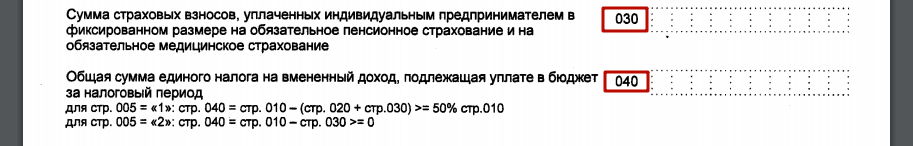 Показатель по стр. 040 не может быть меньше, чем 50% от суммы исчисленного единого налога по стр. 010 |