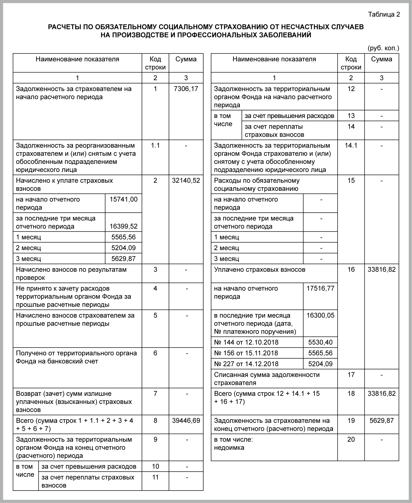 На 01.01.2018 задолженность по взносам на травматизм, указанная в строке 19 графы 3 таблицы 2 4-ФСС за 2017 г., составила 7 306,17 руб. Взносы за сентябрь 2018 г. в сумме 5 530,40 руб. уплачены в октябре 2018 г. Взносы за декабрь 2018 г. в сумме 5 629,87 руб. уплачены в январе 2019 г.