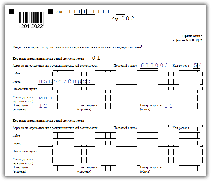 Первоначально записывается кодом вид деятельности, по которому ИП встает на учет как плательщик ЕНВД. После этого вписывается полный адрес осуществления деятельности на ЕНВД. Если при заполнении остаются не заполненные ячейки, их следует прочеркнуть.