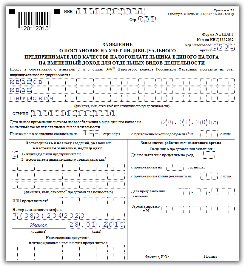 - 1 — если заявление форма ЕНВД-2 подается непосредственно предпринимателем.