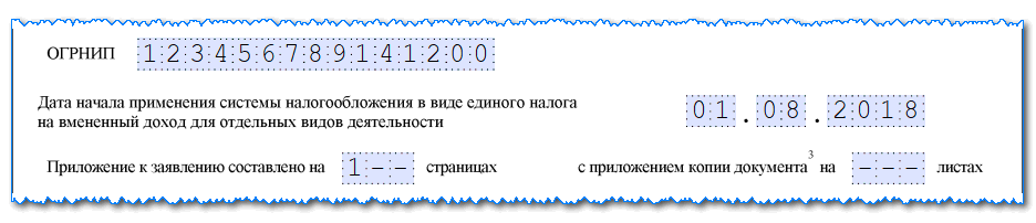 - Заносится код ОГРН компании, дата, с которой начата деятельность с применением единого налога, число страниц приложений к документу.