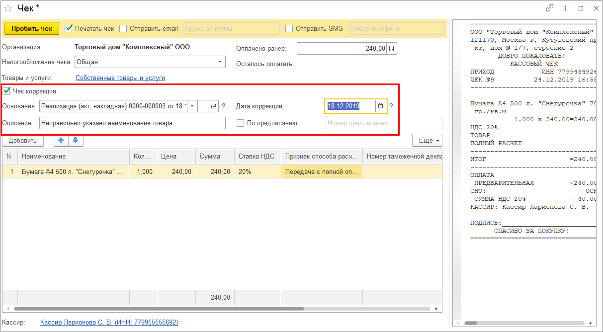 18.12.2019 бухгалтер «ТД «Комплексный» обнаружил ошибку. Пробит чек коррекции.