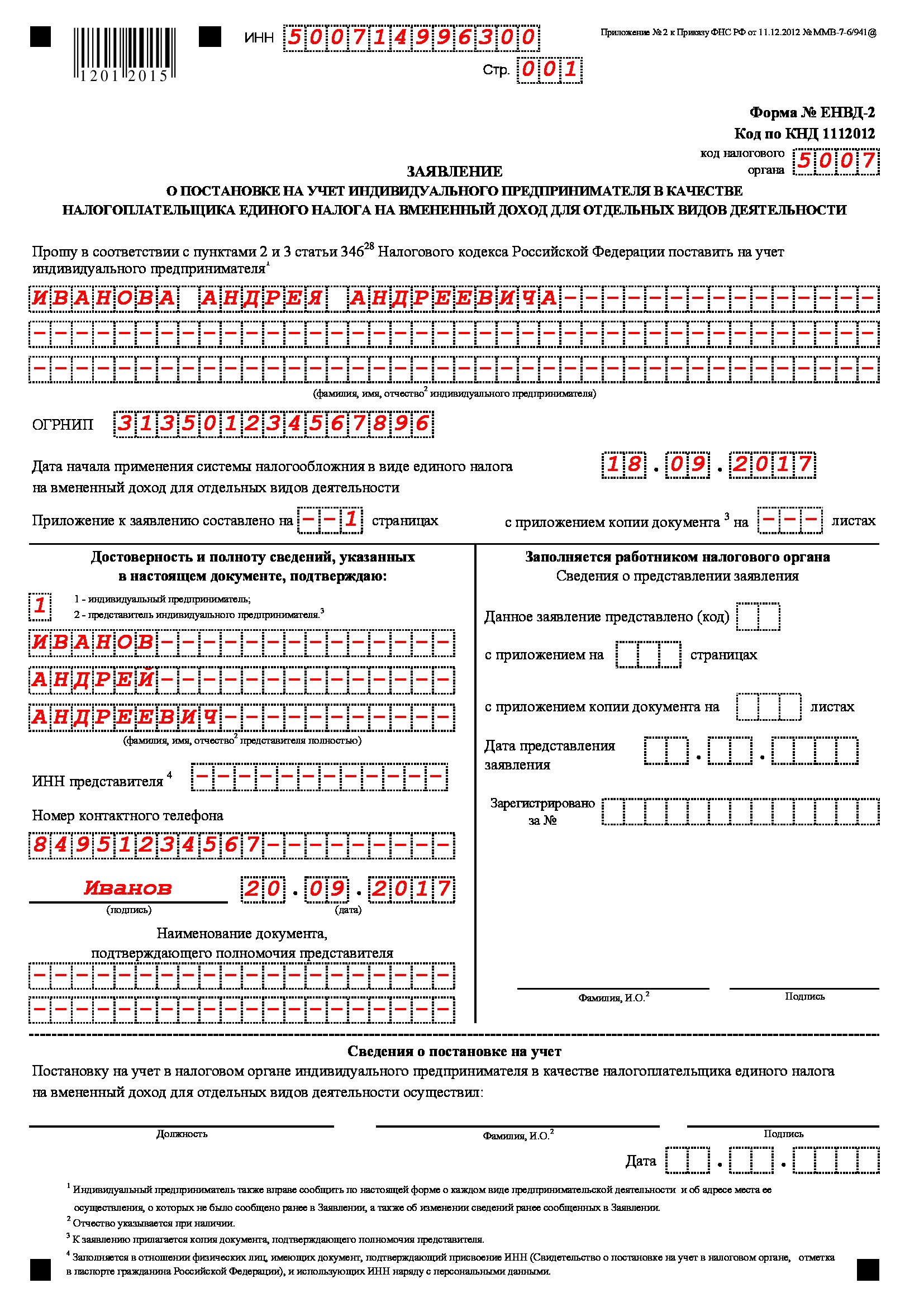 Чтобы получить право использовать ЕНВД, необходимо составить и отправить соответствующее заявление в ФНС в 2-х экземплярах за 5 дней до того, как начнётся осуществление деятельности по вменённому налогу.Чтобы применять «вменёнку» с момента регистрации, необходимо уведомить фискальную службу в срок до 5 дней от даты внесения записи в ЕГРИП. Если предпринимателем не подано заявление, но начато применение ЕНВД, потребуется уплатить все налоги. Помимо этого будет начислен штраф за нарушение порядков, установленных налоговым законодательством, и пени на весь объём неуплаченных налогов. После подачи заявления остаётся ожидать, когда будет выдано уведомление о постановке на учёт в качестве плательщика ЕНВД (срок выдачи – до 5 рабочих дней). Если заявление было заполнено неверно, уведомление не будет выдано.
