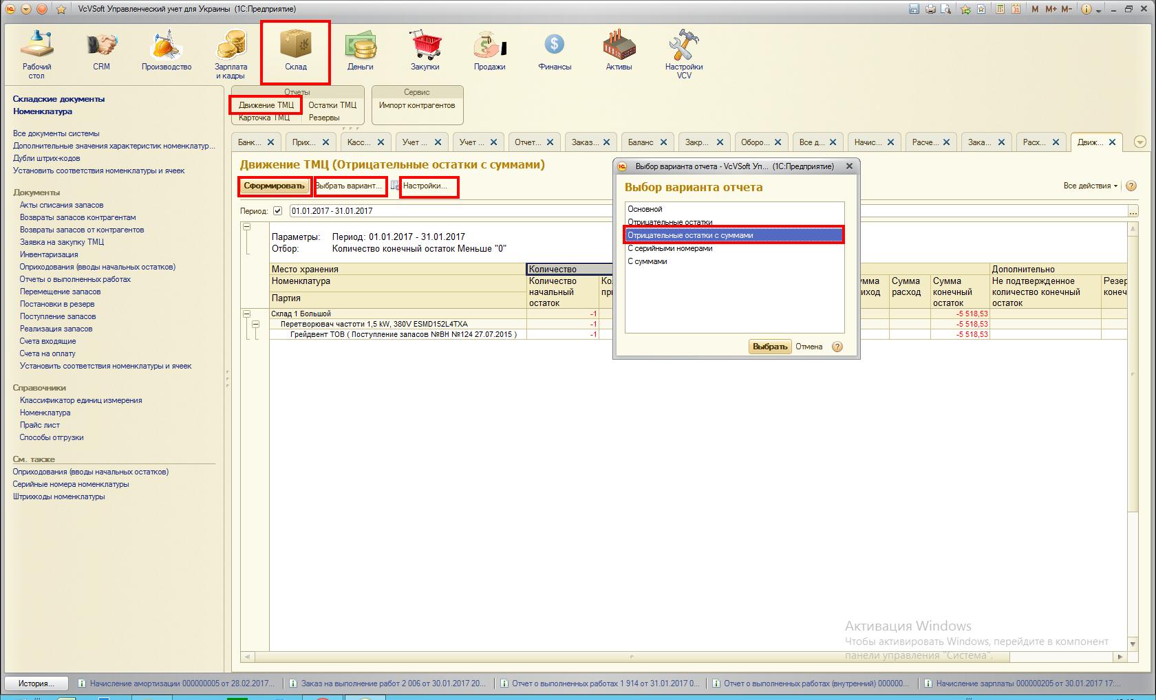 После того как пункт 2 выполнен (суммы колонок Нам должны/Мы должны на конец периода равны), мы проводим документ Учет фактической себестоимости выпущенной продукции и смотрим на «2»-ой счет учета о Оборотно-сальдовой ведомости. В колонке «Мы должны» должен быть 0. Если там стоят суммы, то работаем с документом о движением ТМЦ: Вкладка Склад -> Движение ТМЦ -> Настройки: период -> Выбрать вариант: Отрицательные остатки с суммами -> Сформировать