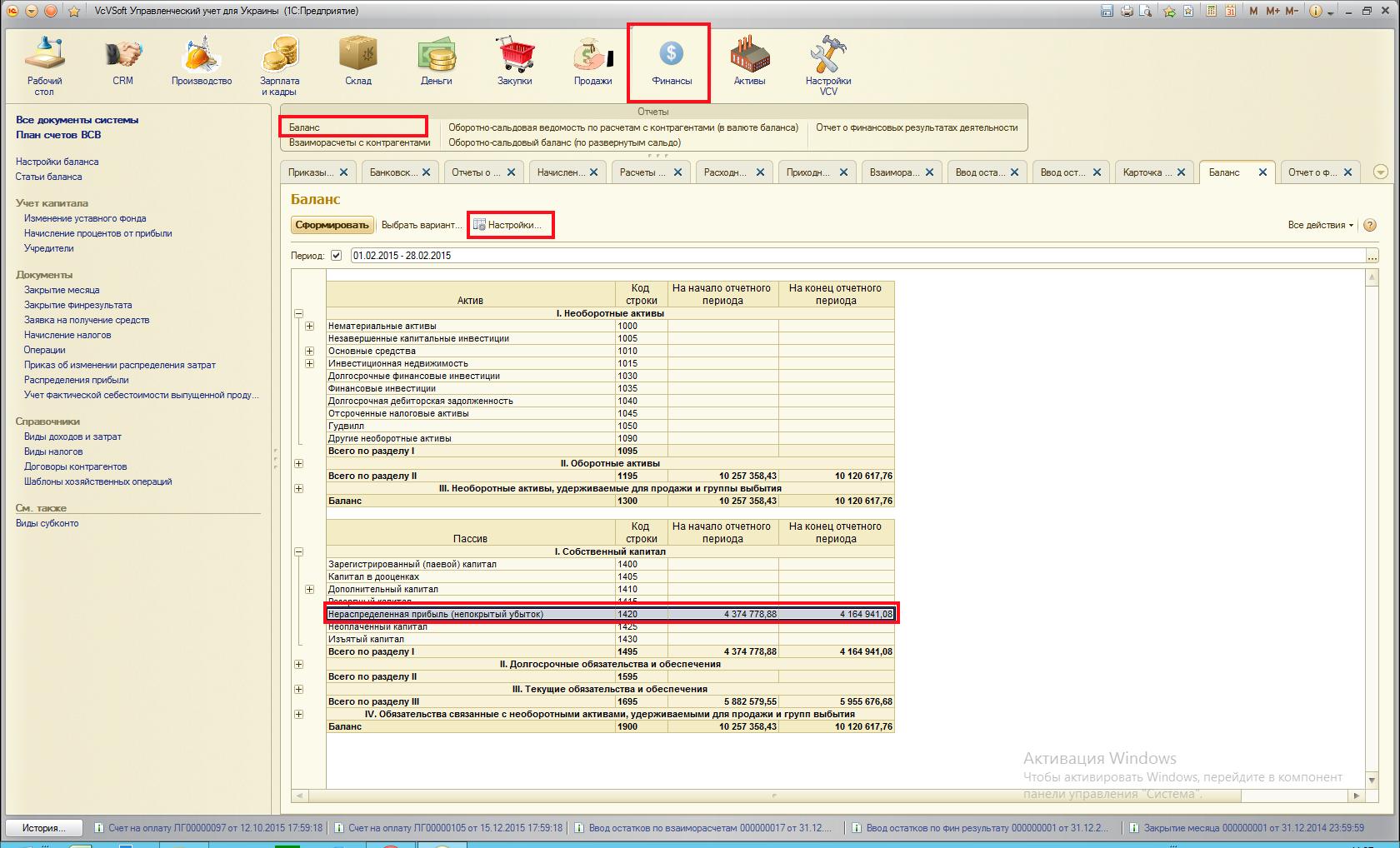Точки контроля – см. пункт 2. Формируем заново документ Баланс и сверяем активы-пасивы как указано в пункте 1. Все сходится. Последняя точка контроля — сравнение суммы по нераспределенной прибыли. Сумма нераспределенной прибыли в отчете о финансовых результатах деятельности и дельта нераспределенной прибыли в балансе должны быть равны! Пример: Вкладка Финансы -> Баланс -> Настройки: период -> Сформировать Находим строку Нераспределенная прибыль (непокрытый убыток) и считаем дельту: 4164941,08- 4374778,88 =209837,8