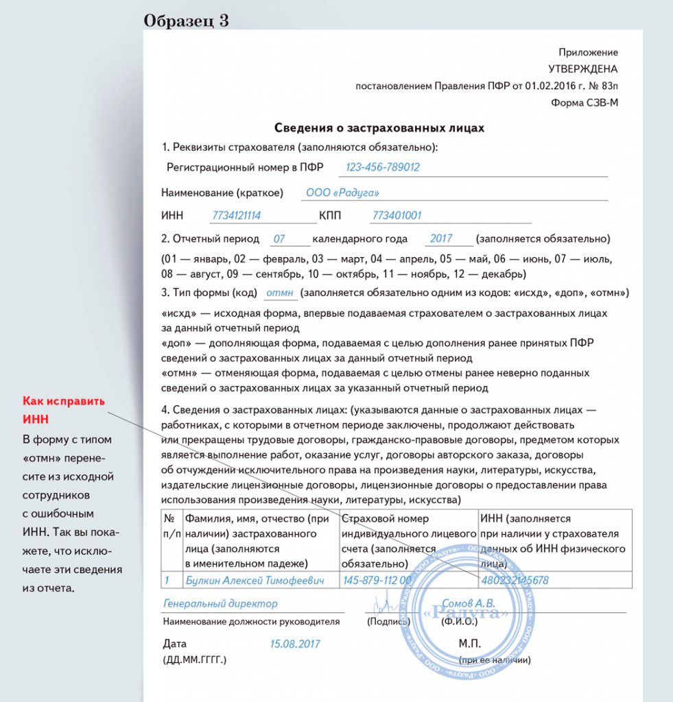 Пример заполнения отменяющей СЗВ-М на 1 человека представлен ниже.