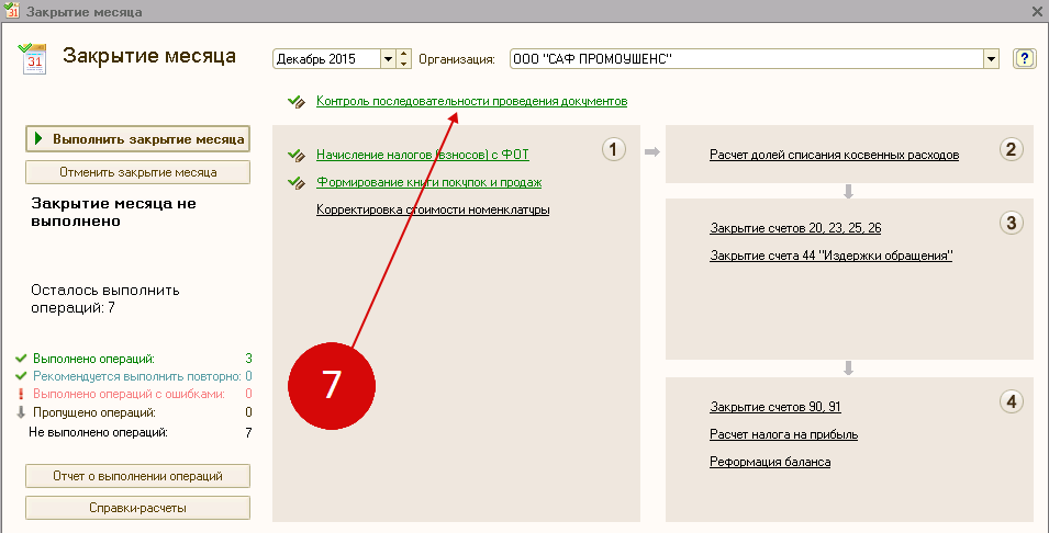 После того как бухгалтерские записи по документам будут последовательно обновлены программой 1С, ссылка «Контроль последовательности проведения документов» станет зеленой (7):