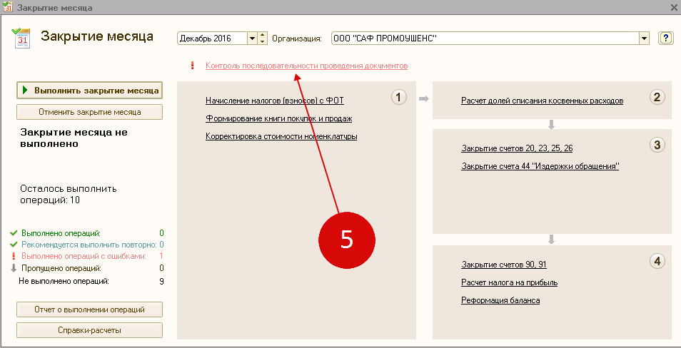 Чтобы правильно закрыть год в 1С 8.2 нужно учесть все операции, которые были зафиксированы в программе в течение года на основании первичных документов. Все документы должны быть учтены в программе в хронологической последовательности. Если вы вносили исправления в документы, то бухгалтерские проводки по ним нужно обновить. Чтобы упростить эту процедуру в 1С 8.2 есть специальная ссылка «Контроль последовательности проведения документов» (5).