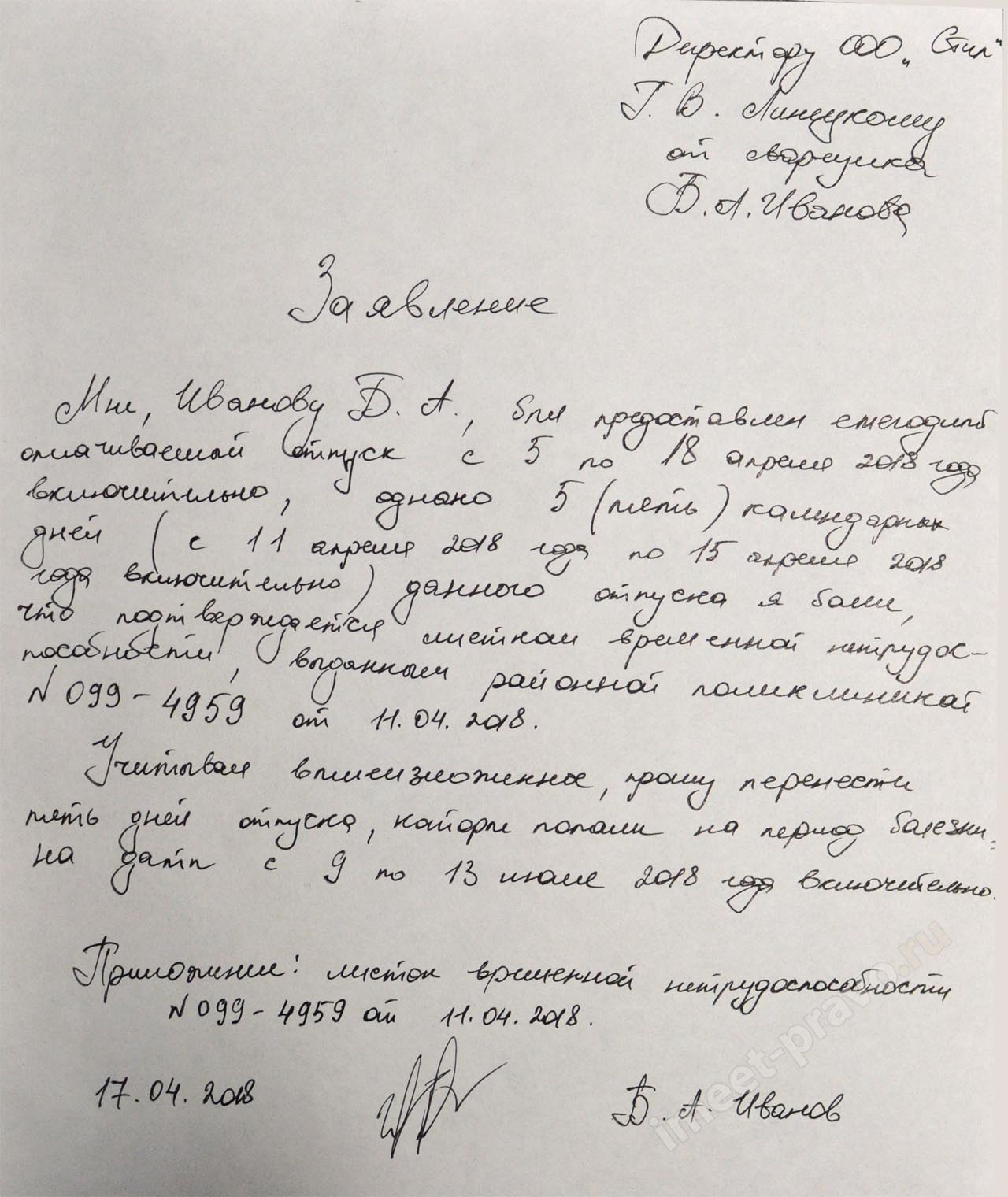 Шаг 1. Работающий пишет заявление с просьбой перенести период отпуска. В заявлении чётко указывается причина, желательно наличие документального подтверждения. Заявление должно быть официально зарегистрировано в журнале: на документе проставляют номер и дату.