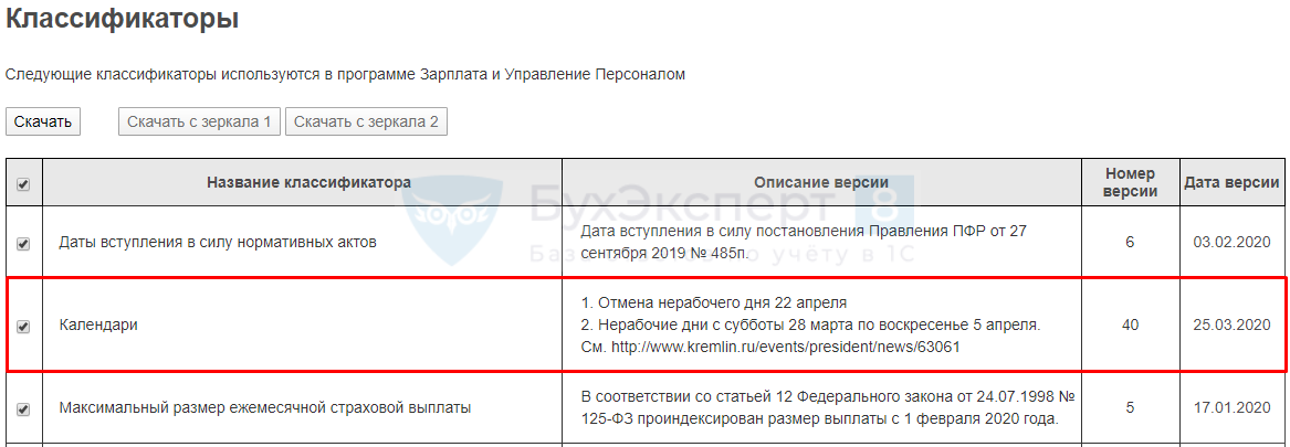 Если же Интернет-поддержка по каким-то причинам не может быть подключена, то можно обновить производственный календарь из файла.