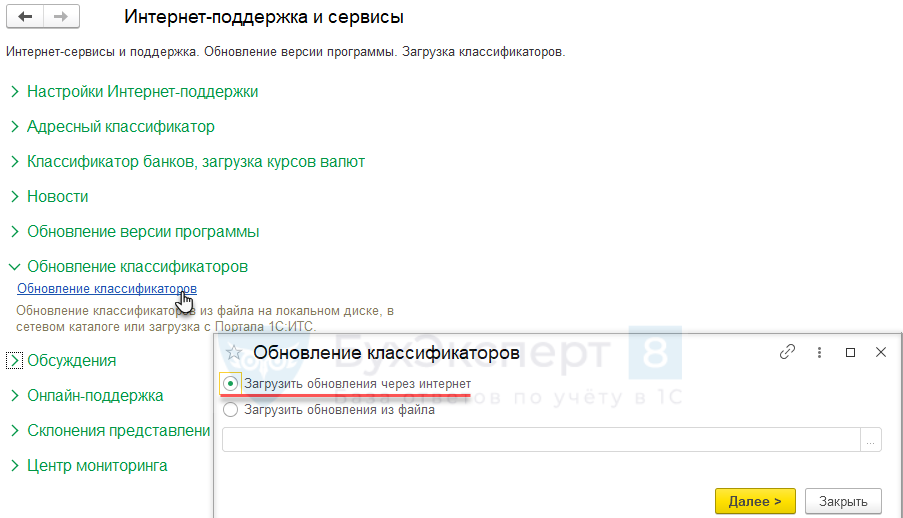Если хочется обновить классификатор немедленно, то можно в разделе Администрирование – Интернет-поддержка и сервисы – Обновление классификаторов перейти по одноименной ссылке и выбрать пункт Загрузить изменения через интернет: