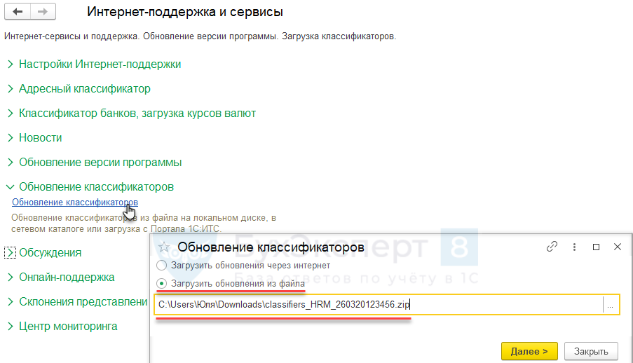 Сохраненный файл можно загрузить в ЗУП. Для этого в разделе Администрирование – Интернет-поддержка и сервисы – Обновление классификаторов следует перейти по одноименной ссылке и выбрать пункт Загрузить изменения из файла: