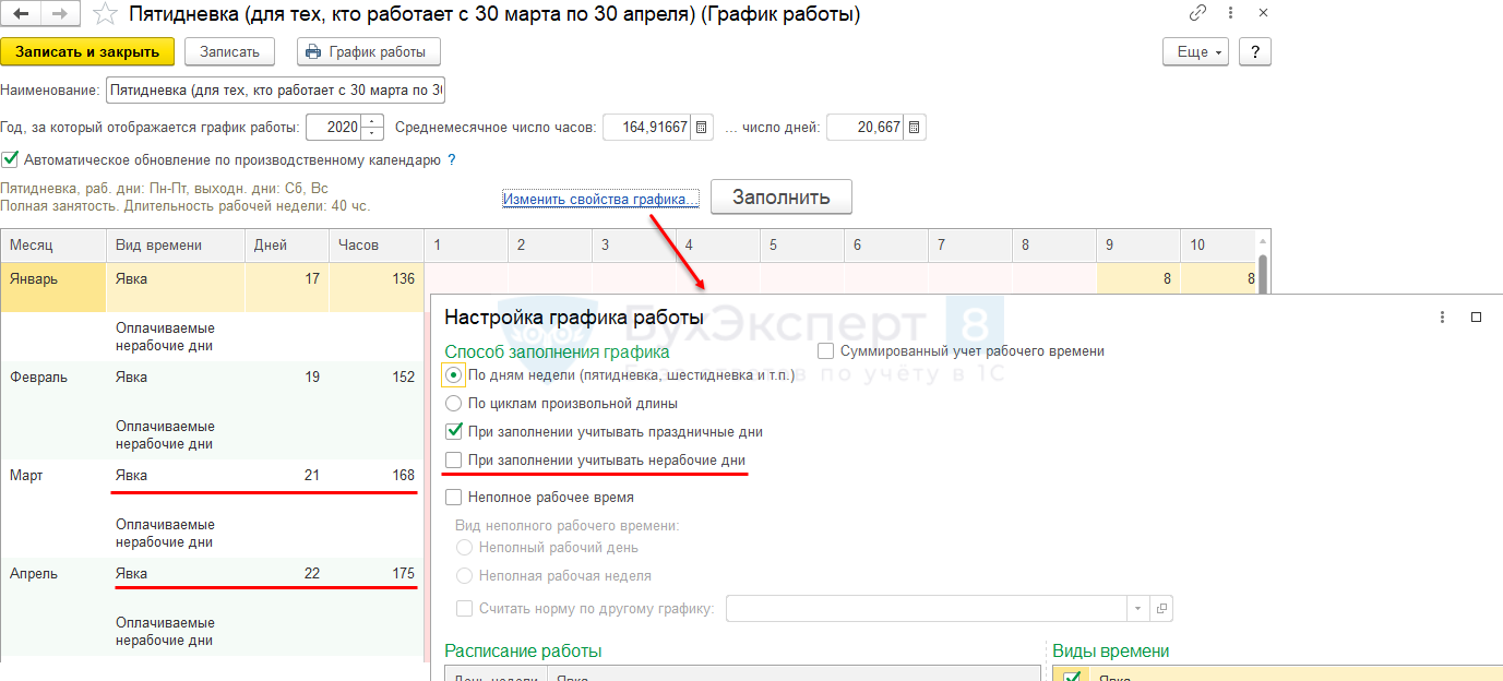 Также графики работы, в которых установлен флажок Автоматическое обновление по производственному календарю будут автоматически обновлены вместе с производственным календарем, другие, если требуется, следует перезаполнить автоматически.