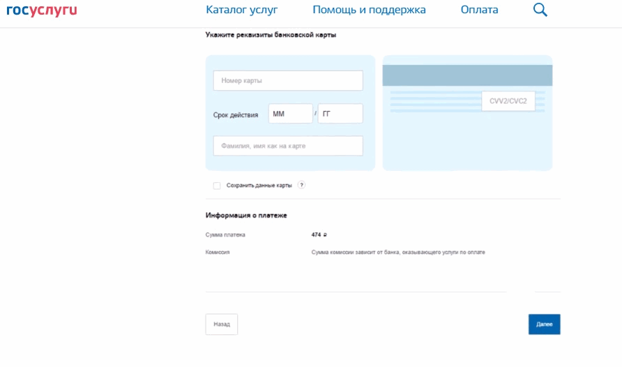 После заполнения всех требуемых полей нажимаем кнопку «Далее». На следующей странице открывается информация о платеже, которую следует внимательно перепроверить. Здесь указан ваш индивидуальный номер платежа, дата совершения оплаты налога, сумма и комиссия. Последняя начисляется в зависимости от условий вашего банка, через который вы совершаете платеж. Чаще всего комиссия за онлайн платеж налога на сайте госуслуг не взимается. Если вы согласны с условиями предоставления услуги, то нажимаете кнопку «Оплатить».