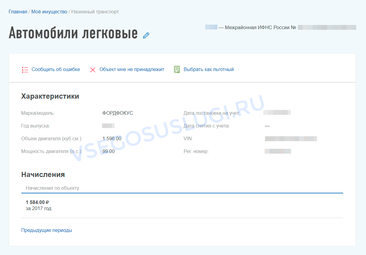 При переходе по объекту налогообложения откроется подробная информация по его характеристикам и начислениям. Здесь же вы можете сообщить об ошибке по объекту в налоговый орган, уведомить о том, объект вам не принадлежит или выбрать его как льготный.