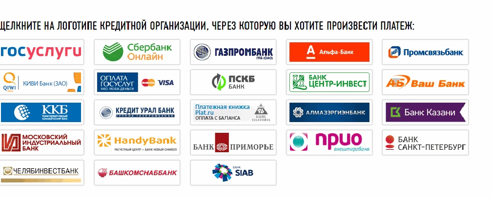 - Вам предложат большой список разных банков, благодаря которым вы можете совершить оплату налога, будучи клиентом определенного банка. Необходимо просто выбрать тот банк, где у вас на зарплатной, расчетной или кредитной карте есть деньги. Для этого будет достаточно просто кликнуть по названию подходящего для вас банка.