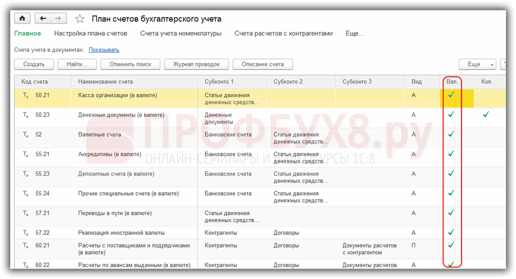 Для ведения валютных операций в программе 1С 8.3 Бухгалтерия предприятия 3.0 в плане счетов существуют специальные счета, имеющие признак валютного учета: